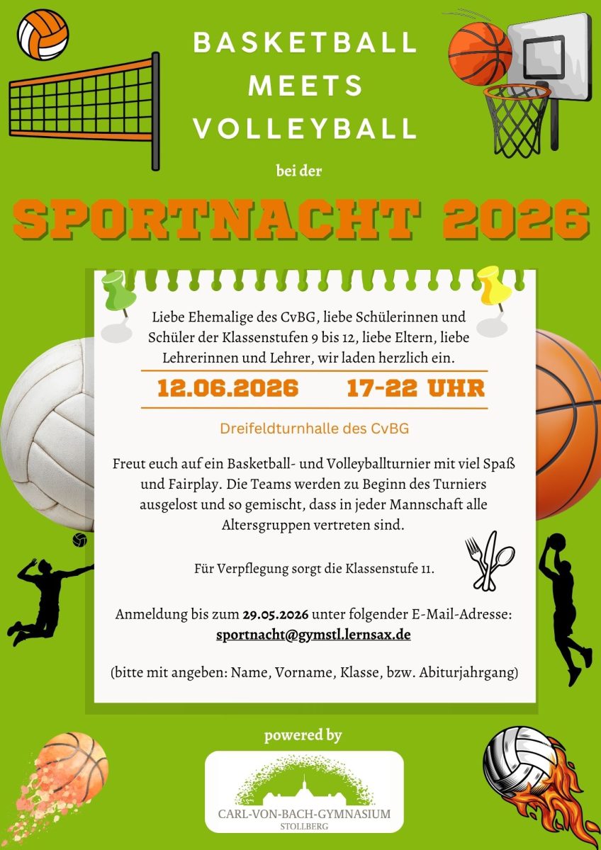 Das Carl-von-Bach-Gymnasium lädt alle interessierten und sportbegeisterten zur Sportnacht am12.06.2026 in die Turnhalle ein. Alle weiteren Informationen entnehmen Sie bitte dem von der Medien-AG gestalteten Plakat.